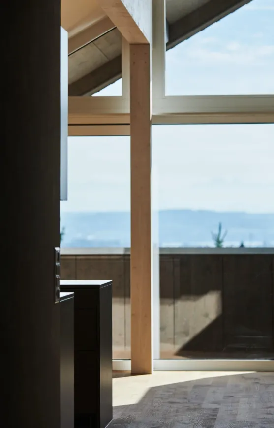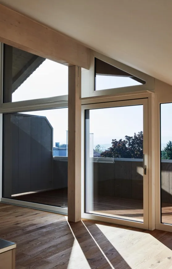 Besonders hervorzuheben sind die Dachwohnungen, die mit ihrer grosszügigen Gestaltung und lichtdurchfluteten Räumen hervorstechen. Von hier aus geniessen die Bewohnerinnen und Bewohner einen atemberaubenden Blick über das malerische Dorf und können bei sonnigem Wetter auch den Murtensee hinter dem Mont Vully erkennen. Die Kombination aus elegantem Holzbau und grossen Fenstern schafft ein helles und einladendes Wohnambiente. Der endgegenkommende Balkon erweitert den Wohnraum ins Freie und lädt dazu ein, die idyllische Umgebung zu geniessen. In dieser Wohnung erleben die Bewohner und Bewohnerinnen ein Gefühl von Freiheit und Weite, das in ländlichen Regionen oft zu finden ist.