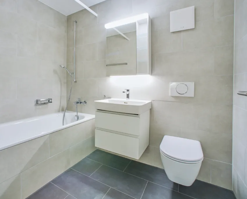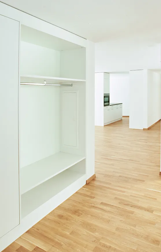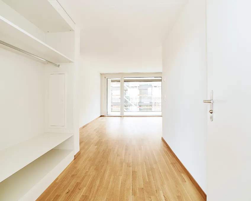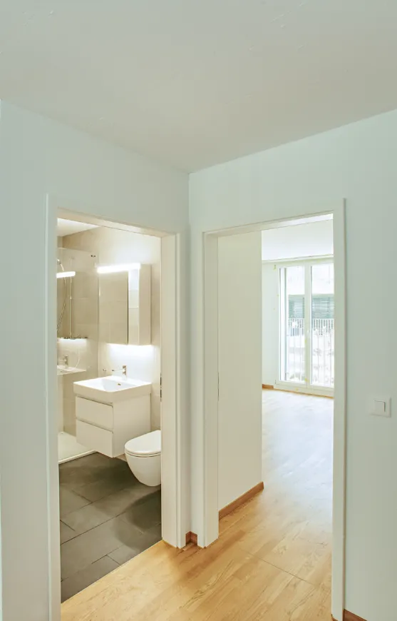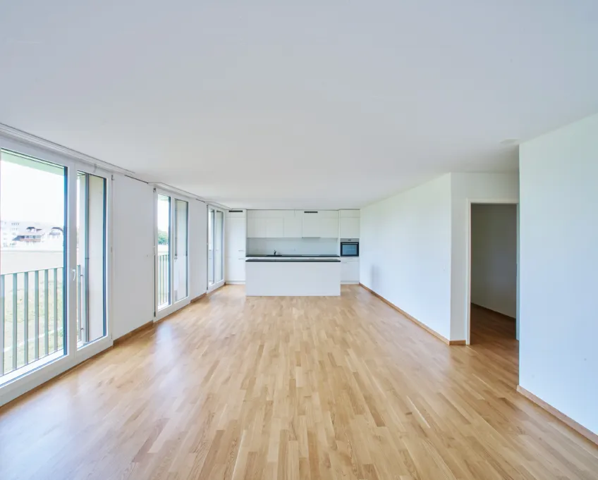 Die Innenräume der neuen Wohnüberbauung in Kehrsatz sind ein Paradebeispiel für modernes Wohnen. Grosszügige Fensterfronten durchfluten die Räume mit natürlichem Licht und schaffen eine einladende Atmosphäre. Die hellen Wand- und Bodenbeläge, kombiniert mit warmen Holzdetails, tragen zur freundlichen und behaglichen Wohnatmosphäre bei.