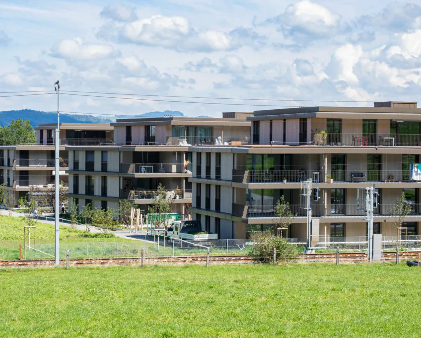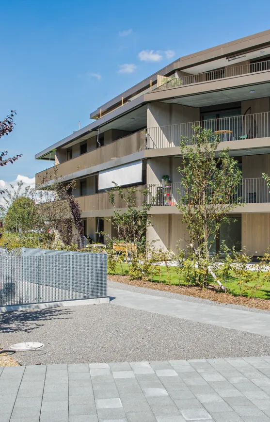 Die Überbauung ist umgeben von üppigem Grün, was zur Ästhetik der Siedlung beitragen. Die gelungene Fassadengestaltung und die naturnahe Einbettung der Gebäude fördern ein harmonisches Wohnumfeld und schaffen ein angenehmes Zuhause.
