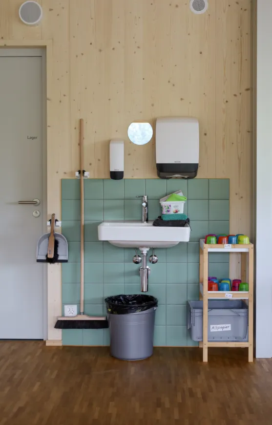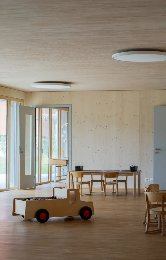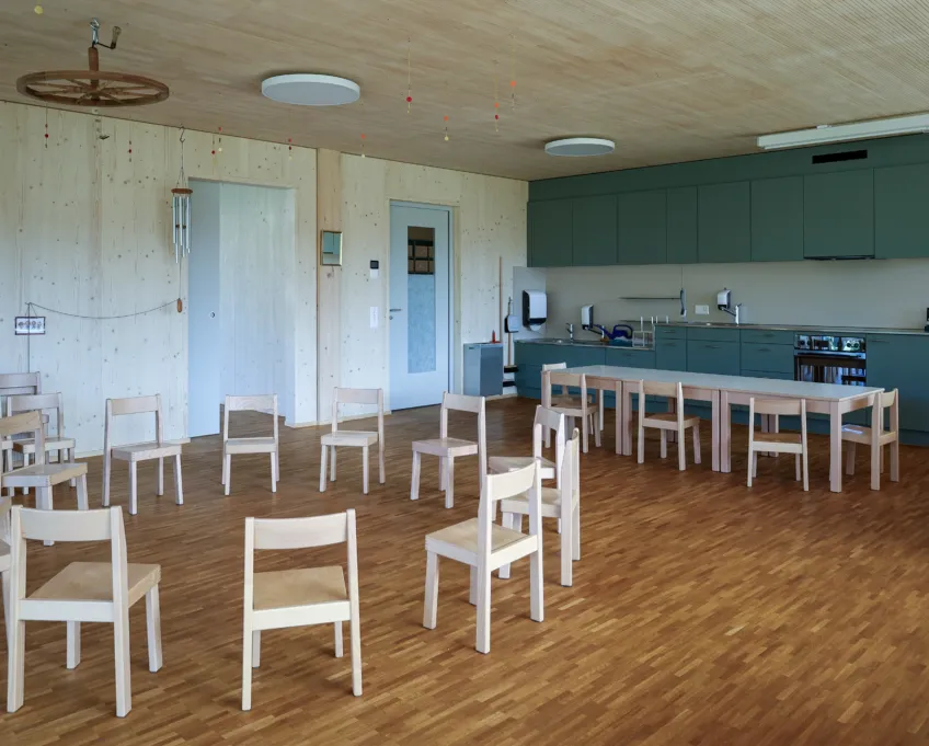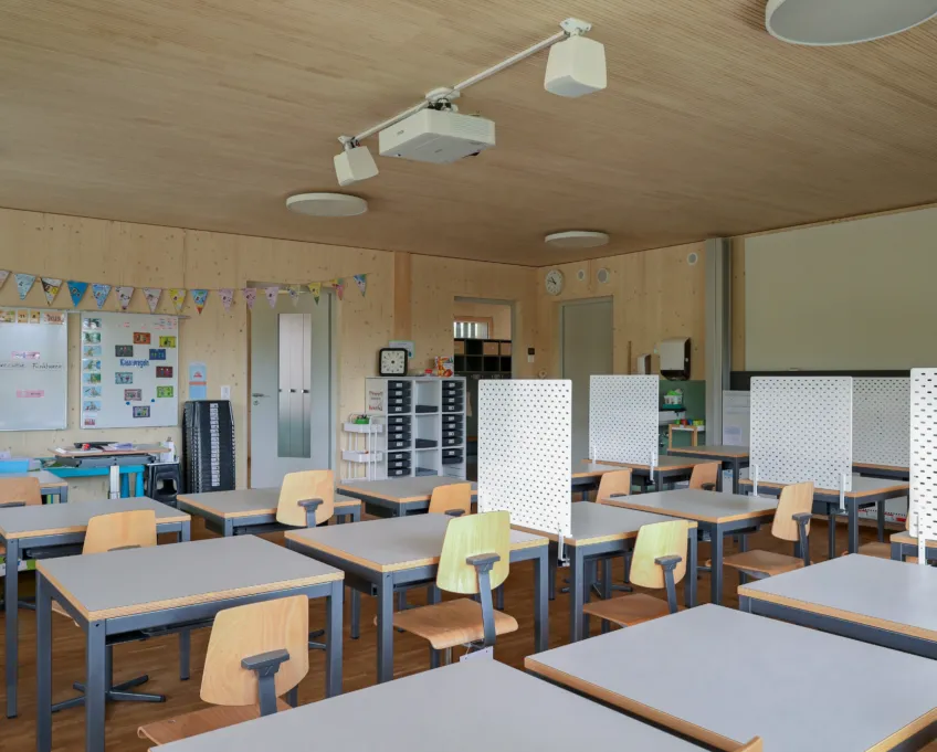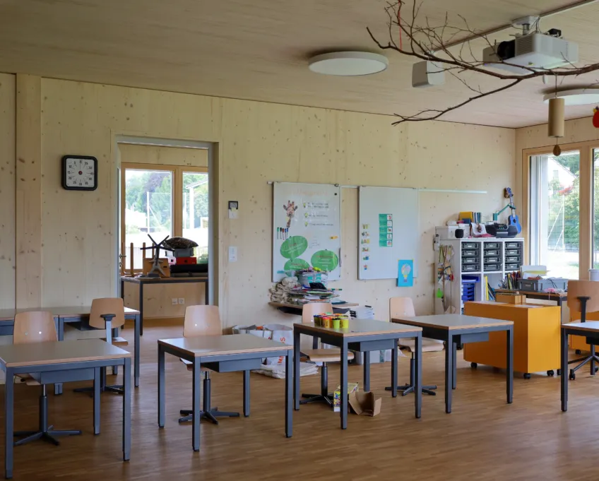Das neue Gebäude aus Holz und Beton (nur Untergeschoss) erstreckt sich über zwei Geschosse, wobei sich der Kindergarten und die Tagesschule im Erd- und die Unterrichtsräume im Obergeschoss befinden. So verfügt der Kindergarten über einen direkten Zugang zur Aussenspielfläche im Süden und die Tagesschule zum nördlichen Aussenbereich. Um möglichst resiliente Strukturen zu schaffen, sind die Räume bewusst offen gestaltet. Dies ermöglicht Nutzungsänderungen in Zukunft und bietet der Schule eine möglichst flexible Raumaufteilung, die den wechselnden Bedürfnissen angepasst werden kann. Ein zentraler Erschliessungskern verbindet alle Räume und vermittelt in alle Richtungen. Die grossen Fenster und die zusätzlichen Oblichter durchfluten die Räume mit Tageslicht und sorgen für ein angenehmes Aufenthaltsgefühl.